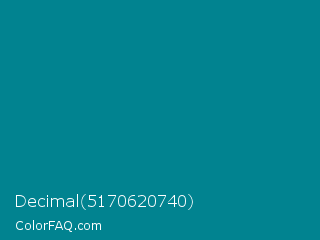 Decimal 5170620740 Color is a dark cyan color and the nearest color is Dark Cyan #008b8b. Hex code #018390 and RGB value is rgb(1,131,144). In RGB color space, this color is composed of 0% red, 51% green, 56% blue, In CMYK color space, this color is composed of 99% cyan, 9% magenta, 0% yellow , 44% black , In HSL color space, this color has a hue angle of 185° , 99% saturation and 28% lightness.