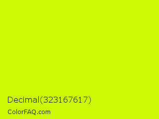 Decimal 323167617 Color is a normal lime color and the nearest color is Electric Lime #ccff00. Hex code #ccf705 and RGB value is rgb(204,247,5). In RGB color space, this color is composed of 80% red, 97% green, 2% blue, In CMYK color space, this color is composed of 17% cyan, 0% magenta, 98% yellow , 3% black , In HSL color space, this color has a hue angle of 71° , 96% saturation and 49% lightness.