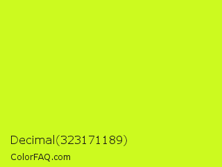 Decimal 323171189 Color is a normal lime color and the nearest color is Arctic Lime #d0ff14. Hex code #ccfa1f and RGB value is rgb(204,250,31). In RGB color space, this color is composed of 80% red, 98% green, 12% blue, In CMYK color space, this color is composed of 18% cyan, 0% magenta, 88% yellow , 2% black , In HSL color space, this color has a hue angle of 73° , 96% saturation and 55% lightness.