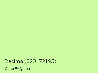 Decimal 323172195 Color is a very light green color and the nearest color is Reef #c9ffa2. Hex code #ccfba3 and RGB value is rgb(204,251,163). In RGB color space, this color is composed of 80% red, 98% green, 64% blue, In CMYK color space, this color is composed of 19% cyan, 0% magenta, 35% yellow , 2% black , In HSL color space, this color has a hue angle of 92° , 92% saturation and 81% lightness.