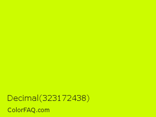Decimal 323172438 Color is a normal lime color and the nearest color is Electric Lime #ccff00. Hex code #ccfc00 and RGB value is rgb(204,252,0). In RGB color space, this color is composed of 80% red, 99% green, 0% blue, In CMYK color space, this color is composed of 19% cyan, 0% magenta, 100% yellow , 1% black , In HSL color space, this color has a hue angle of 71° , 100% saturation and 49% lightness.