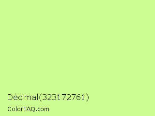 Decimal 323172761 Color is a light green color and the nearest color is Reef #c9ffa2. Hex code #ccfc8f and RGB value is rgb(204,252,143). In RGB color space, this color is composed of 80% red, 99% green, 56% blue, In CMYK color space, this color is composed of 19% cyan, 0% magenta, 43% yellow , 1% black , In HSL color space, this color has a hue angle of 86° , 95% saturation and 77% lightness.