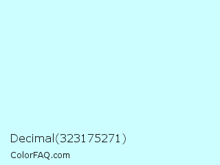 Decimal 323175271 Color is a very light cyan color and the nearest color is Onahau #cdf4ff. Hex code #ccfdff and RGB value is rgb(204,253,255). In RGB color space, this color is composed of 80% red, 99% green, 100% blue, In CMYK color space, this color is composed of 20% cyan, 1% magenta, 0% yellow , 0% black , In HSL color space, this color has a hue angle of 182° , 100% saturation and 90% lightness.