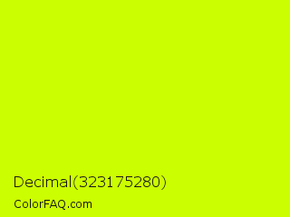 Decimal 323175280 Color is a normal lime color and the nearest color is Electric Lime #ccff00. Hex code #ccfe02 and RGB value is rgb(204,254,2). In RGB color space, this color is composed of 80% red, 100% green, 1% blue, In CMYK color space, this color is composed of 20% cyan, 0% magenta, 99% yellow , 0% black , In HSL color space, this color has a hue angle of 72° , 99% saturation and 50% lightness.