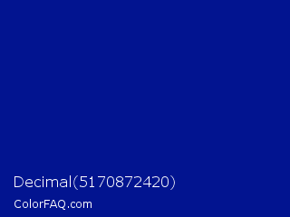 Decimal 5170872420 Color is a dark blue color and the nearest color is Phthalo Blue #000f89. Hex code #021490 and RGB value is rgb(2,20,144). In RGB color space, this color is composed of 1% red, 8% green, 56% blue, In CMYK color space, this color is composed of 99% cyan, 86% magenta, 0% yellow , 44% black , In HSL color space, this color has a hue angle of 232° , 97% saturation and 29% lightness.