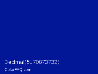 Decimal 5170873732 Color is a dark blue color and the nearest color is Indigo Dye #091f92. Hex code #021698 and RGB value is rgb(2,22,152). In RGB color space, this color is composed of 1% red, 9% green, 60% blue, In CMYK color space, this color is composed of 99% cyan, 86% magenta, 0% yellow , 40% black , In HSL color space, this color has a hue angle of 232° , 97% saturation and 30% lightness.