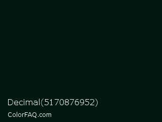 Decimal 5170876952 Color is a almost black green color and the nearest color is Holly #011d13. Hex code #021912 and RGB value is rgb(2,25,18). In RGB color space, this color is composed of 1% red, 10% green, 7% blue, In CMYK color space, this color is composed of 92% cyan, 0% magenta, 28% yellow , 90% black , In HSL color space, this color has a hue angle of 162° , 85% saturation and 5% lightness.