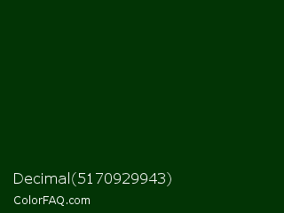 Decimal 5170929943 Color is a very dark green color and the nearest color is Deep Fir #002900. Hex code #023405 and RGB value is rgb(2,52,5). In RGB color space, this color is composed of 1% red, 20% green, 2% blue, In CMYK color space, this color is composed of 96% cyan, 0% magenta, 90% yellow , 80% black , In HSL color space, this color has a hue angle of 124° , 93% saturation and 11% lightness.