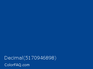 Decimal 5170946898 Color is a dark blue color and the nearest color is Congress Blue #02478e. Hex code #024490 and RGB value is rgb(2,68,144). In RGB color space, this color is composed of 1% red, 27% green, 56% blue, In CMYK color space, this color is composed of 99% cyan, 53% magenta, 0% yellow , 44% black , In HSL color space, this color has a hue angle of 212° , 97% saturation and 29% lightness.
