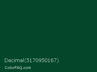 Decimal 5170950167 Color is a very dark green color and the nearest color is British Racing Green #004225. Hex code #024729 and RGB value is rgb(2,71,41). In RGB color space, this color is composed of 1% red, 28% green, 16% blue, In CMYK color space, this color is composed of 97% cyan, 0% magenta, 42% yellow , 72% black , In HSL color space, this color has a hue angle of 154° , 95% saturation and 14% lightness.