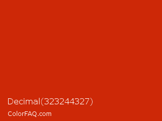 Decimal 323244327 Color is a normal red color and the nearest color is Thunderbird #c02b18. Hex code #cd2807 and RGB value is rgb(205,40,7). In RGB color space, this color is composed of 80% red, 16% green, 3% blue, In CMYK color space, this color is composed of 0% cyan, 80% magenta, 97% yellow , 20% black , In HSL color space, this color has a hue angle of 10° , 93% saturation and 42% lightness.