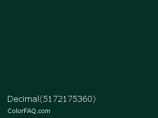 Decimal 5172175360 Color is a very dark cyan color and the nearest color is Bottle Green #093624. Hex code #043028 and RGB value is rgb(4,48,40). In RGB color space, this color is composed of 2% red, 19% green, 16% blue, In CMYK color space, this color is composed of 92% cyan, 0% magenta, 17% yellow , 81% black , In HSL color space, this color has a hue angle of 169° , 85% saturation and 10% lightness.