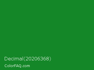 Decimal 20206368 Color is a dark green color and the nearest color is Forest Green #228b22. Hex code #148728 and RGB value is rgb(20,135,40). In RGB color space, this color is composed of 8% red, 53% green, 16% blue, In CMYK color space, this color is composed of 85% cyan, 0% magenta, 70% yellow , 47% black , In HSL color space, this color has a hue angle of 130° , 74% saturation and 30% lightness.