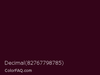 Decimal 82767798785 Color is a very dark rose color and the nearest color is Toledo #3a0020. Hex code #340419 and RGB value is rgb(52,4,25). In RGB color space, this color is composed of 20% red, 2% green, 10% blue, In CMYK color space, this color is composed of 0% cyan, 92% magenta, 52% yellow , 80% black , In HSL color space, this color has a hue angle of 334° , 86% saturation and 11% lightness.