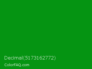 Decimal 5173162772 Color is a dark green color and the nearest color is Islamic Green #009000. Hex code #059412 and RGB value is rgb(5,148,18). In RGB color space, this color is composed of 2% red, 58% green, 7% blue, In CMYK color space, this color is composed of 97% cyan, 0% magenta, 88% yellow , 42% black , In HSL color space, this color has a hue angle of 125° , 93% saturation and 30% lightness.