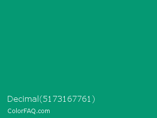 Decimal 5173167761 Color is a normal cyan color and the nearest color is Green NCS #009f6b. Hex code #059973 and RGB value is rgb(5,153,115). In RGB color space, this color is composed of 2% red, 60% green, 45% blue, In CMYK color space, this color is composed of 97% cyan, 0% magenta, 25% yellow , 40% black , In HSL color space, this color has a hue angle of 165° , 94% saturation and 31% lightness.