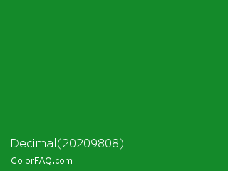 Decimal 20209808 Color is a normal green color and the nearest color is Forest Green #228b22. Hex code #148a2a and RGB value is rgb(20,138,42). In RGB color space, this color is composed of 8% red, 54% green, 16% blue, In CMYK color space, this color is composed of 86% cyan, 0% magenta, 70% yellow , 46% black , In HSL color space, this color has a hue angle of 131° , 75% saturation and 31% lightness.
