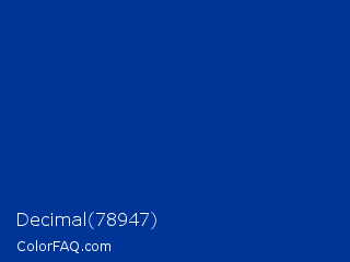 Decimal 78947 Color is a dark blue color and the nearest color is Smalt #003399. Hex code #003497 and RGB value is rgb(0,52,151). In RGB color space, this color is composed of 0% red, 20% green, 59% blue, In CMYK color space, this color is composed of 100% cyan, 66% magenta, 0% yellow , 41% black , In HSL color space, this color has a hue angle of 219° , 100% saturation and 30% lightness.