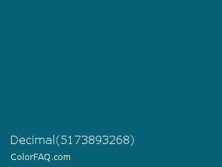 Decimal 5173893268 Color is a dark cyan color and the nearest color is Mosque #036a6e. Hex code #066176 and RGB value is rgb(6,97,118). In RGB color space, this color is composed of 2% red, 38% green, 46% blue, In CMYK color space, this color is composed of 95% cyan, 18% magenta, 0% yellow , 54% black , In HSL color space, this color has a hue angle of 191° , 90% saturation and 24% lightness.