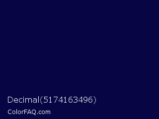 Decimal 5174163496 Color is a very dark indigo color and the nearest color is Stratos #000741. Hex code #070544 and RGB value is rgb(7,5,68). In RGB color space, this color is composed of 3% red, 2% green, 27% blue, In CMYK color space, this color is composed of 90% cyan, 93% magenta, 0% yellow , 73% black , In HSL color space, this color has a hue angle of 242° , 86% saturation and 14% lightness.