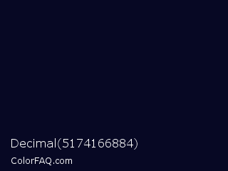 Decimal 5174166884 Color is a almost black blue color and the nearest color is Deep Ebony #0c0b1d. Hex code #070824 and RGB value is rgb(7,8,36). In RGB color space, this color is composed of 3% red, 3% green, 14% blue, In CMYK color space, this color is composed of 81% cyan, 78% magenta, 0% yellow , 86% black , In HSL color space, this color has a hue angle of 238° , 67% saturation and 8% lightness.