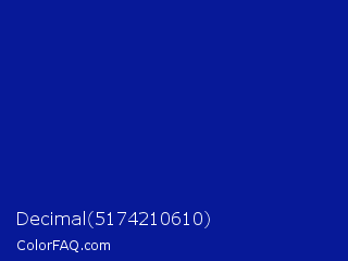 Decimal 5174210610 Color is a normal blue color and the nearest color is Indigo Dye #091f92. Hex code #071998 and RGB value is rgb(7,25,152). In RGB color space, this color is composed of 3% red, 10% green, 60% blue, In CMYK color space, this color is composed of 95% cyan, 84% magenta, 0% yellow , 40% black , In HSL color space, this color has a hue angle of 233° , 91% saturation and 31% lightness.