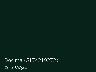 Decimal 5174219272 Color is a almost black green color and the nearest color is Aztec #0d1c19. Hex code #072218 and RGB value is rgb(7,34,24). In RGB color space, this color is composed of 3% red, 13% green, 9% blue, In CMYK color space, this color is composed of 79% cyan, 0% magenta, 29% yellow , 87% black , In HSL color space, this color has a hue angle of 158° , 66% saturation and 8% lightness.