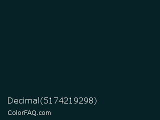 Decimal 5174219298 Color is a almost black cyan color and the nearest color is Daintree #012731. Hex code #072226 and RGB value is rgb(7,34,38). In RGB color space, this color is composed of 3% red, 13% green, 15% blue, In CMYK color space, this color is composed of 82% cyan, 11% magenta, 0% yellow , 85% black , In HSL color space, this color has a hue angle of 188° , 69% saturation and 9% lightness.