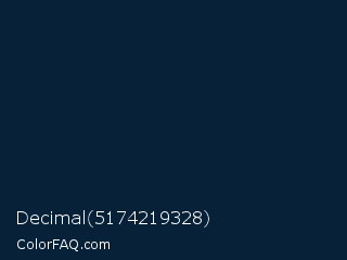 Decimal 5174219328 Color is a very dark blue color and the nearest color is Daintree #012731. Hex code #072238 and RGB value is rgb(7,34,56). In RGB color space, this color is composed of 3% red, 13% green, 22% blue, In CMYK color space, this color is composed of 88% cyan, 39% magenta, 0% yellow , 78% black , In HSL color space, this color has a hue angle of 207° , 78% saturation and 12% lightness.