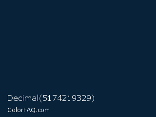 Decimal 5174219329 Color is a very dark blue color and the nearest color is Maastricht Blue #001c3d. Hex code #072239 and RGB value is rgb(7,34,57). In RGB color space, this color is composed of 3% red, 13% green, 22% blue, In CMYK color space, this color is composed of 88% cyan, 40% magenta, 0% yellow , 78% black , In HSL color space, this color has a hue angle of 208° , 78% saturation and 13% lightness.