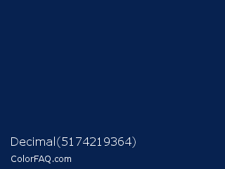 Decimal 5174219364 Color is a very dark blue color and the nearest color is Downriver #092256. Hex code #072250 and RGB value is rgb(7,34,80). In RGB color space, this color is composed of 3% red, 13% green, 31% blue, In CMYK color space, this color is composed of 91% cyan, 58% magenta, 0% yellow , 69% black , In HSL color space, this color has a hue angle of 218° , 84% saturation and 17% lightness.