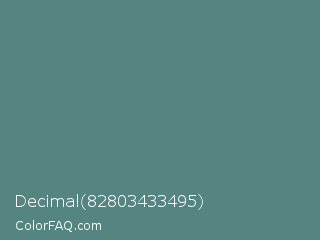 Decimal 82803433495 Color is a normal cyan color and the nearest color is Wintergreen Dream #56887d. Hex code #558581 and RGB value is rgb(85,133,129). In RGB color space, this color is composed of 33% red, 52% green, 51% blue, In CMYK color space, this color is composed of 36% cyan, 0% magenta, 3% yellow , 48% black , In HSL color space, this color has a hue angle of 175° , 22% saturation and 43% lightness.