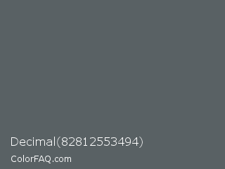 Decimal 82812553494 Color is a normal blue color and the nearest color is Storm Dust #646463. Hex code #596164 and RGB value is rgb(89,97,100). In RGB color space, this color is composed of 35% red, 38% green, 39% blue, In CMYK color space, this color is composed of 11% cyan, 3% magenta, 0% yellow , 61% black , In HSL color space, this color has a hue angle of 196° , 6% saturation and 37% lightness.