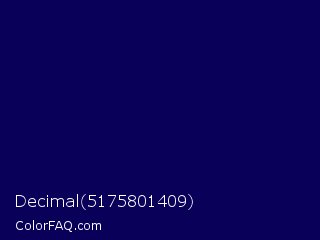 Decimal 5175801409 Color is a very dark indigo color and the nearest color is Gulf Blue #051657. Hex code #090059 and RGB value is rgb(9,0,89). In RGB color space, this color is composed of 4% red, 0% green, 35% blue, In CMYK color space, this color is composed of 90% cyan, 100% magenta, 0% yellow , 65% black , In HSL color space, this color has a hue angle of 246° , 100% saturation and 17% lightness.