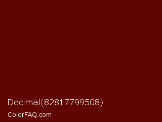 Decimal 82817799508 Color is a very dark red color and the nearest color is Rosewood #65000b. Hex code #610502 and RGB value is rgb(97,5,2). In RGB color space, this color is composed of 38% red, 2% green, 1% blue, In CMYK color space, this color is composed of 0% cyan, 95% magenta, 98% yellow , 62% black , In HSL color space, this color has a hue angle of 2° , 96% saturation and 19% lightness.