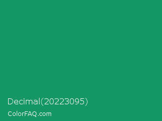 Decimal 20223095 Color is a normal green color and the nearest color is Green Cyan #009966. Hex code #149765 and RGB value is rgb(20,151,101). In RGB color space, this color is composed of 8% red, 59% green, 40% blue, In CMYK color space, this color is composed of 87% cyan, 0% magenta, 33% yellow , 41% black , In HSL color space, this color has a hue angle of 157° , 77% saturation and 34% lightness.