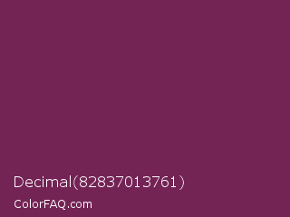 Decimal 82837013761 Color is a dark magenta color and the nearest color is Finn #692d54. Hex code #742355 and RGB value is rgb(116,35,85). In RGB color space, this color is composed of 45% red, 14% green, 33% blue, In CMYK color space, this color is composed of 0% cyan, 70% magenta, 27% yellow , 55% black , In HSL color space, this color has a hue angle of 323° , 54% saturation and 30% lightness.