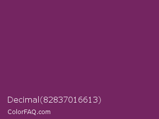 Decimal 82837016613 Color is a dark magenta color and the nearest color is Byzantium #702963. Hex code #742561 and RGB value is rgb(116,37,97). In RGB color space, this color is composed of 45% red, 15% green, 38% blue, In CMYK color space, this color is composed of 0% cyan, 68% magenta, 16% yellow , 55% black , In HSL color space, this color has a hue angle of 314° , 52% saturation and 30% lightness.