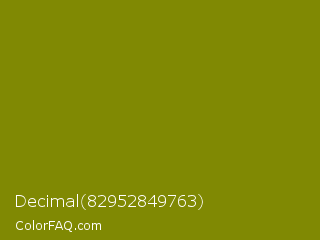 Decimal 82952849763 Color is a dark yellow color and the nearest color is Olive #808000. Hex code #808903 and RGB value is rgb(128,137,3). In RGB color space, this color is composed of 50% red, 54% green, 1% blue, In CMYK color space, this color is composed of 7% cyan, 0% magenta, 98% yellow , 46% black , In HSL color space, this color has a hue angle of 64° , 96% saturation and 27% lightness.