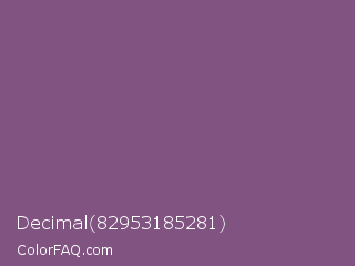 Decimal 82953185281 Color is a normal magenta color and the nearest color is Razzmic Berry #8d4e85. Hex code #815381 and RGB value is rgb(129,83,129). In RGB color space, this color is composed of 51% red, 33% green, 51% blue, In CMYK color space, this color is composed of 0% cyan, 36% magenta, 0% yellow , 49% black , In HSL color space, this color has a hue angle of 300° , 22% saturation and 42% lightness.