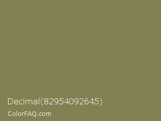 Decimal 82954092645 Color is a normal yellow color and the nearest color is Gold Fusion #85754e. Hex code #828151 and RGB value is rgb(130,129,81). In RGB color space, this color is composed of 51% red, 51% green, 32% blue, In CMYK color space, this color is composed of 0% cyan, 1% magenta, 38% yellow , 49% black , In HSL color space, this color has a hue angle of 59° , 23% saturation and 41% lightness.