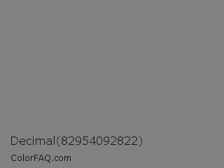 Decimal 82954092822 Color is a normal indigo color and the nearest color is Battleship Grey #848482. Hex code #828184 and RGB value is rgb(130,129,132). In RGB color space, this color is composed of 51% red, 51% green, 52% blue, In CMYK color space, this color is composed of 2% cyan, 2% magenta, 0% yellow , 48% black , In HSL color space, this color has a hue angle of 260° , 1% saturation and 51% lightness.