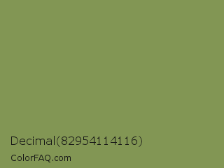 Decimal 82954114116 Color is a normal lime color and the nearest color is Moss Green #8a9a5b. Hex code #829654 and RGB value is rgb(130,150,84). In RGB color space, this color is composed of 51% red, 59% green, 33% blue, In CMYK color space, this color is composed of 13% cyan, 0% magenta, 44% yellow , 41% black , In HSL color space, this color has a hue angle of 78° , 28% saturation and 46% lightness.