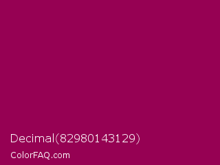 Decimal 82980143129 Color is a dark magenta color and the nearest color is Cardinal Pink #8c055e. Hex code #960153 and RGB value is rgb(150,1,83). In RGB color space, this color is composed of 59% red, 0% green, 33% blue, In CMYK color space, this color is composed of 0% cyan, 99% magenta, 45% yellow , 41% black , In HSL color space, this color has a hue angle of 327° , 99% saturation and 30% lightness.