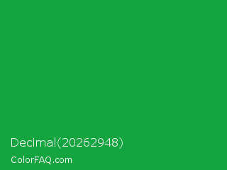 Decimal 20262948 Color is a normal green color and the nearest color is Green Pantone #00ad43. Hex code #14a540 and RGB value is rgb(20,165,64). In RGB color space, this color is composed of 8% red, 65% green, 25% blue, In CMYK color space, this color is composed of 88% cyan, 0% magenta, 61% yellow , 35% black , In HSL color space, this color has a hue angle of 138° , 78% saturation and 36% lightness.