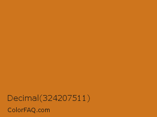 Decimal 324207511 Color is a normal orange color and the nearest color is Ochre #cc7722. Hex code #ce751d and RGB value is rgb(206,117,29). In RGB color space, this color is composed of 81% red, 46% green, 11% blue, In CMYK color space, this color is composed of 0% cyan, 43% magenta, 86% yellow , 19% black , In HSL color space, this color has a hue angle of 30° , 75% saturation and 46% lightness.