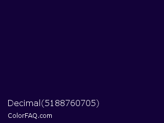 Decimal 5188760705 Color is a very dark indigo color and the nearest color is Black Rock #0d0332. Hex code #130239 and RGB value is rgb(19,2,57). In RGB color space, this color is composed of 7% red, 1% green, 22% blue, In CMYK color space, this color is composed of 67% cyan, 96% magenta, 0% yellow , 78% black , In HSL color space, this color has a hue angle of 259° , 93% saturation and 12% lightness.
