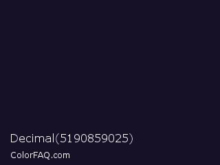 Decimal 5190859025 Color is a very dark indigo color and the nearest color is Mirage #161928. Hex code #161127 and RGB value is rgb(22,17,39). In RGB color space, this color is composed of 9% red, 7% green, 15% blue, In CMYK color space, this color is composed of 44% cyan, 56% magenta, 0% yellow , 85% black , In HSL color space, this color has a hue angle of 254° , 39% saturation and 11% lightness.