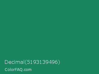 Decimal 5193139496 Color is a normal green color and the nearest color is Deep Green Cyan Turquoise #0e7c61. Hex code #198660 and RGB value is rgb(25,134,96). In RGB color space, this color is composed of 10% red, 53% green, 38% blue, In CMYK color space, this color is composed of 81% cyan, 0% magenta, 28% yellow , 47% black , In HSL color space, this color has a hue angle of 159° , 69% saturation and 31% lightness.