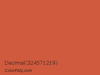Decimal 324571219 Color is a normal red color and the nearest color is Dark Coral #cd5b45. Hex code #cf5a3d and RGB value is rgb(207,90,61). In RGB color space, this color is composed of 81% red, 35% green, 24% blue, In CMYK color space, this color is composed of 0% cyan, 57% magenta, 71% yellow , 19% black , In HSL color space, this color has a hue angle of 12° , 60% saturation and 53% lightness.